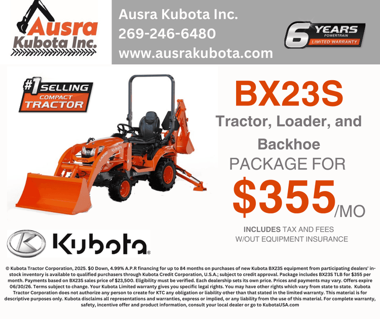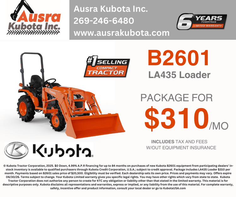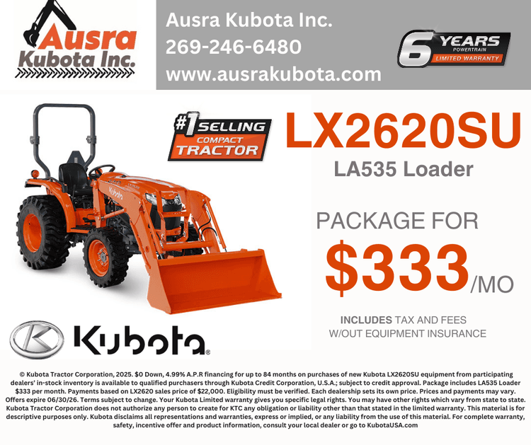 If you're looking for quality equipment and exceptional services provided by trained experts, you've come to the right place. At Ausra Kubota, we pride ourselves on matching each customer's unique needs with the Kubota that will serve them best. We're glad you're here, where you can check out our inventory, order parts, schedule a service appointment or simply give us a call at 269-246-6480 and let us know how we can help you.