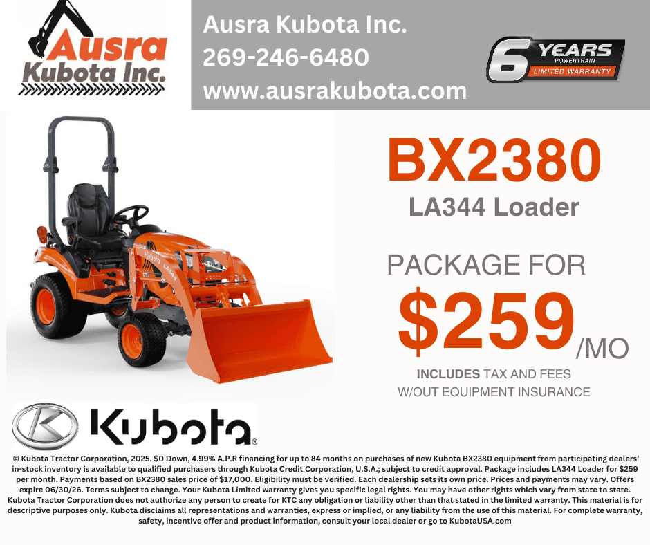 Perfect for homeowners and small acreage owners, the BX2380 offers the durability, comfort, and efficiency Kubota tractors are known for in a compact, easy-to-operate package. ?