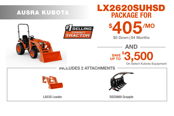 Tame brush, logs, and debris with confidence. The Land Tamer Package pairs the Kubota LX2620SUHSD with a front loader, third-function hydraulics, and a 60″ grapple—giving you serious grab-and-go power in a compact, easy-to-run machine.
